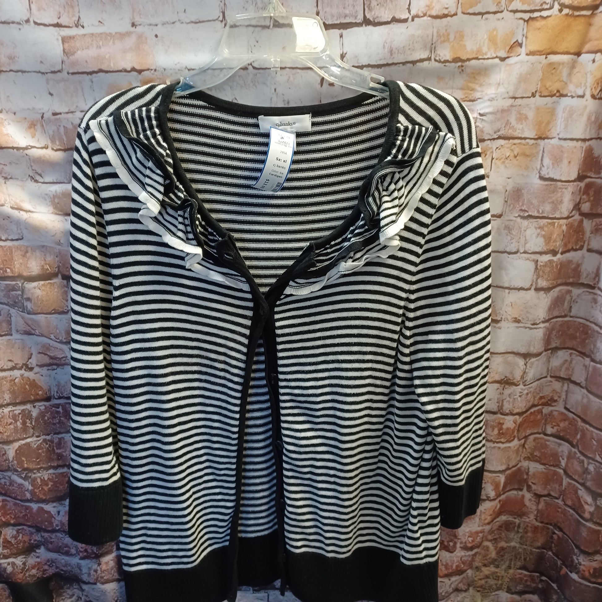 Love this three quarter sleeve cardigan with button up front in black and white stripe and cute ruffle on the collar.