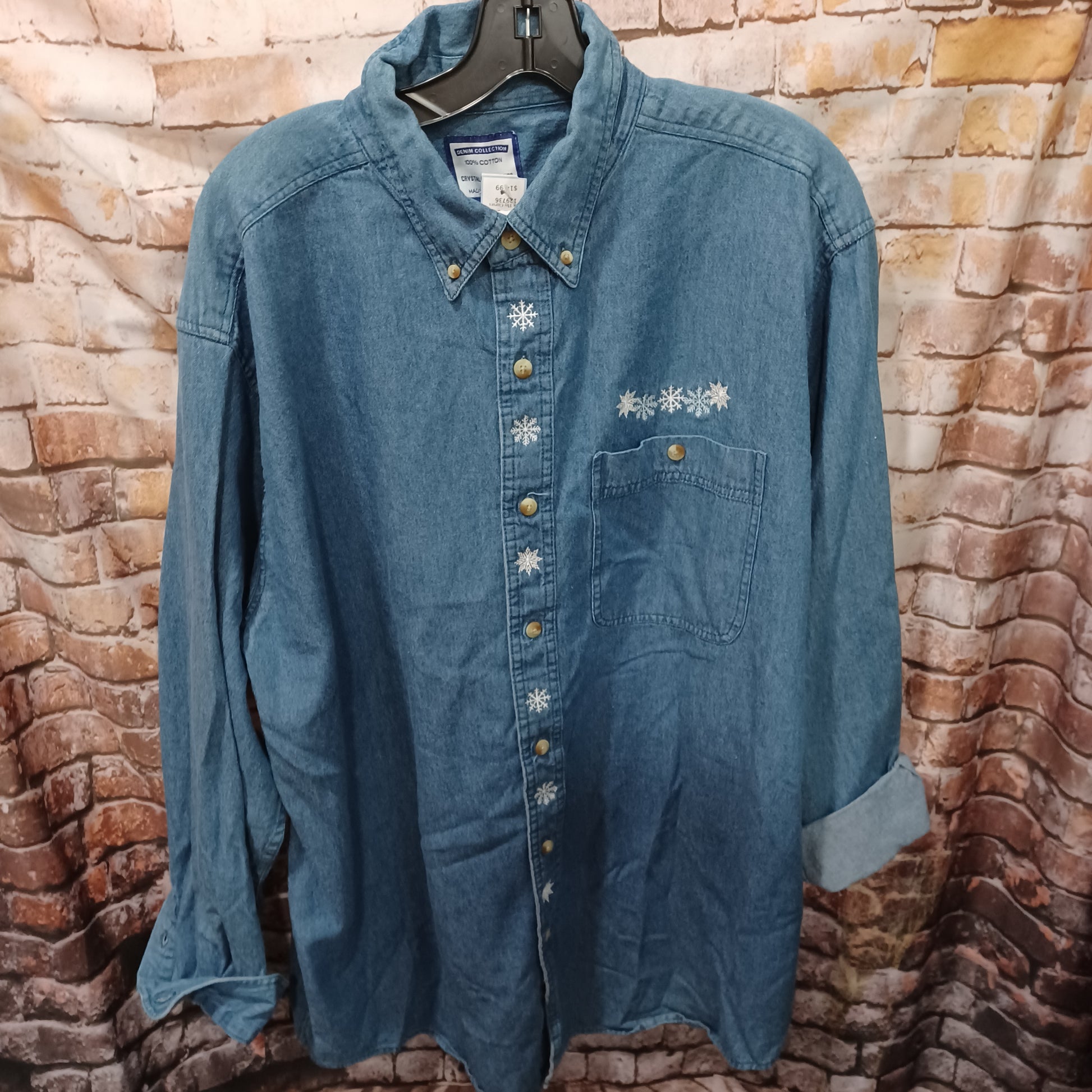 Long sleeve denim shirt with button up front and snowflake embroidered design that can be worn all winter long.