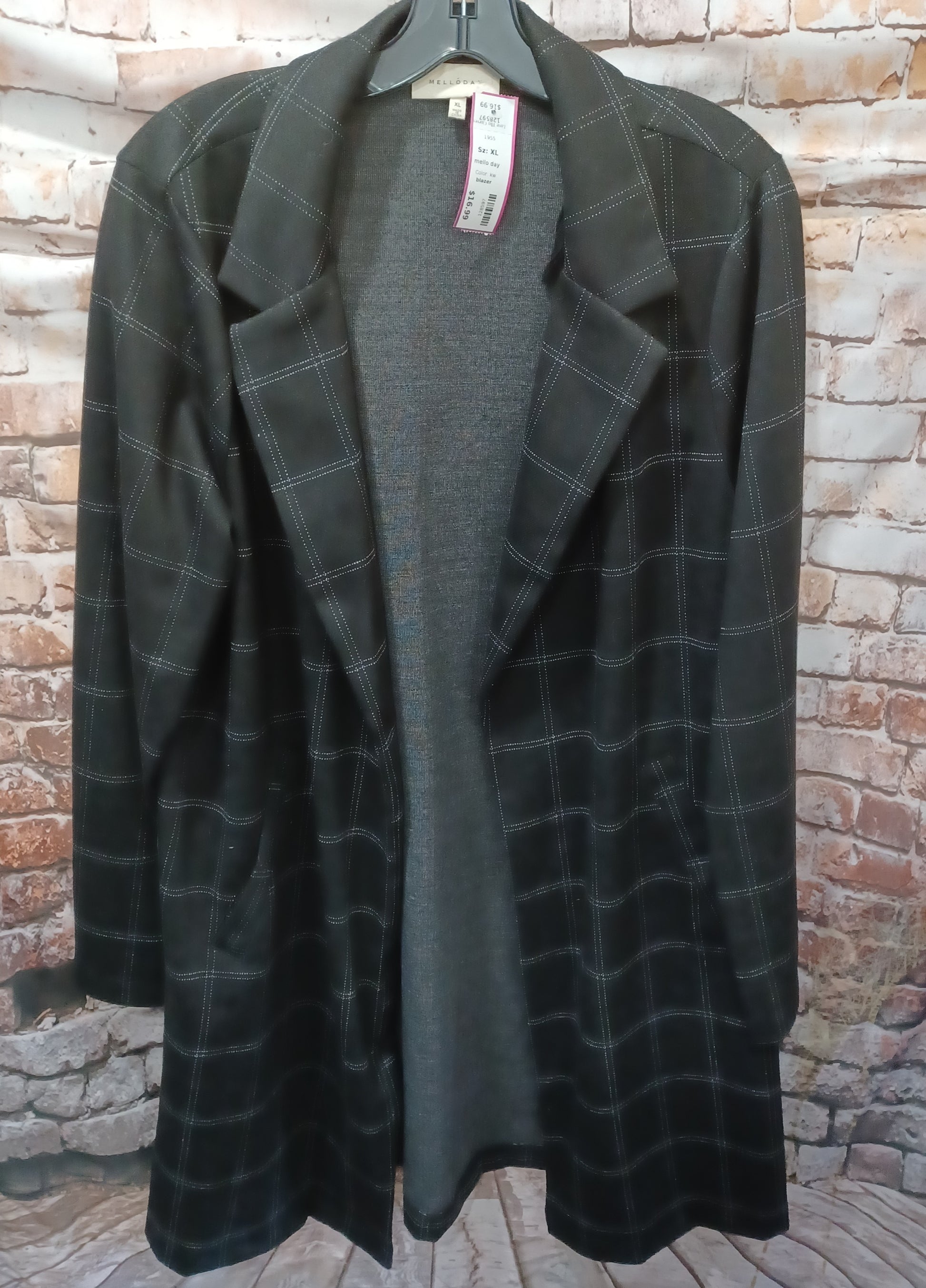 Long sleeve no close front blazer in a duster style fashion. Longer fit in black and white print.