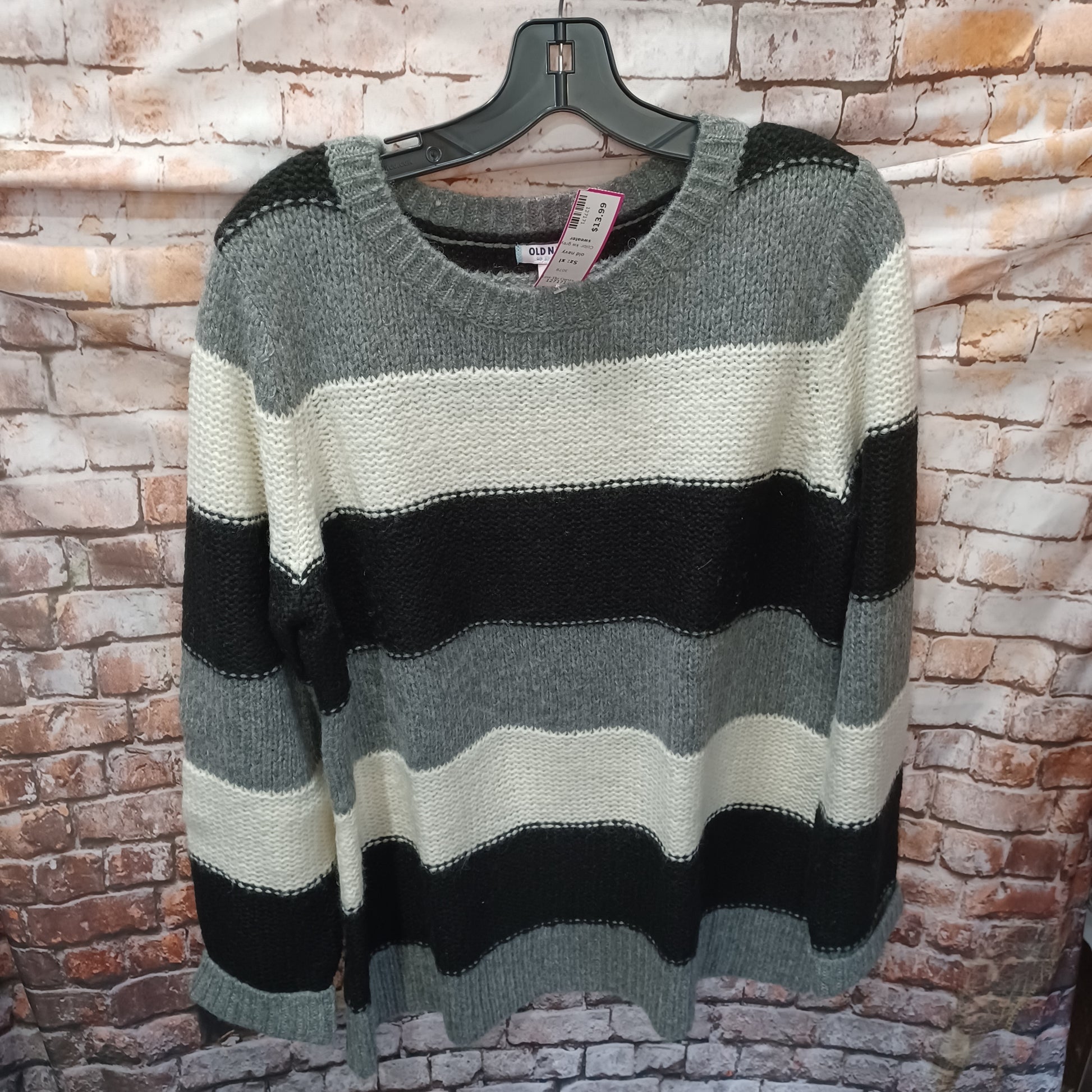 Long sleeve black white and grey striped sweater.
