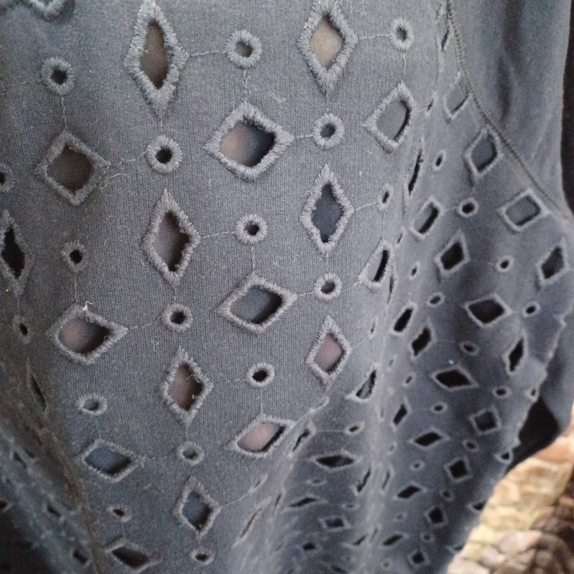Long sleeve sweatshirt in navy blue with die cut front that is double layered for modesty.