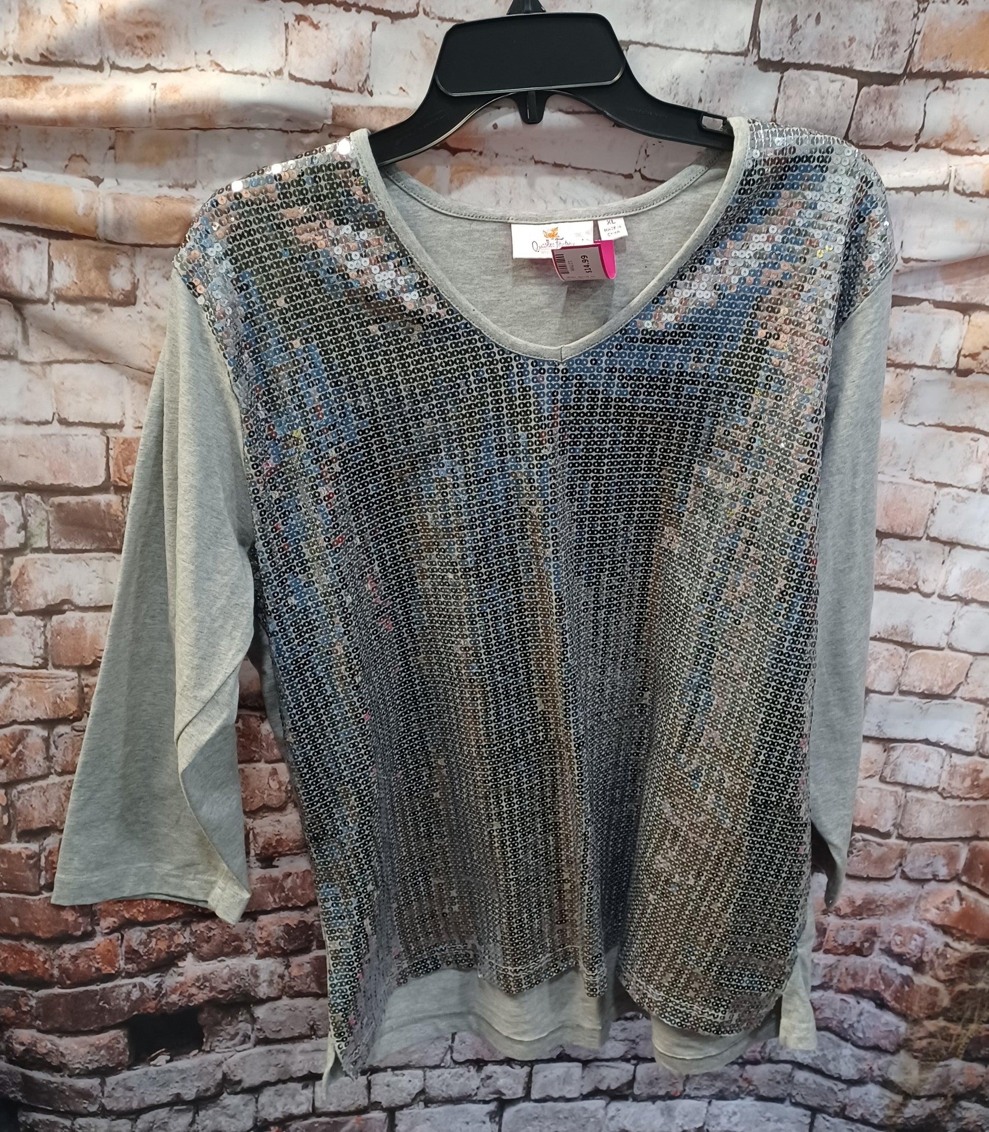 Three quarter sleeve knit top in grey with silver sequins covering the front panel,
