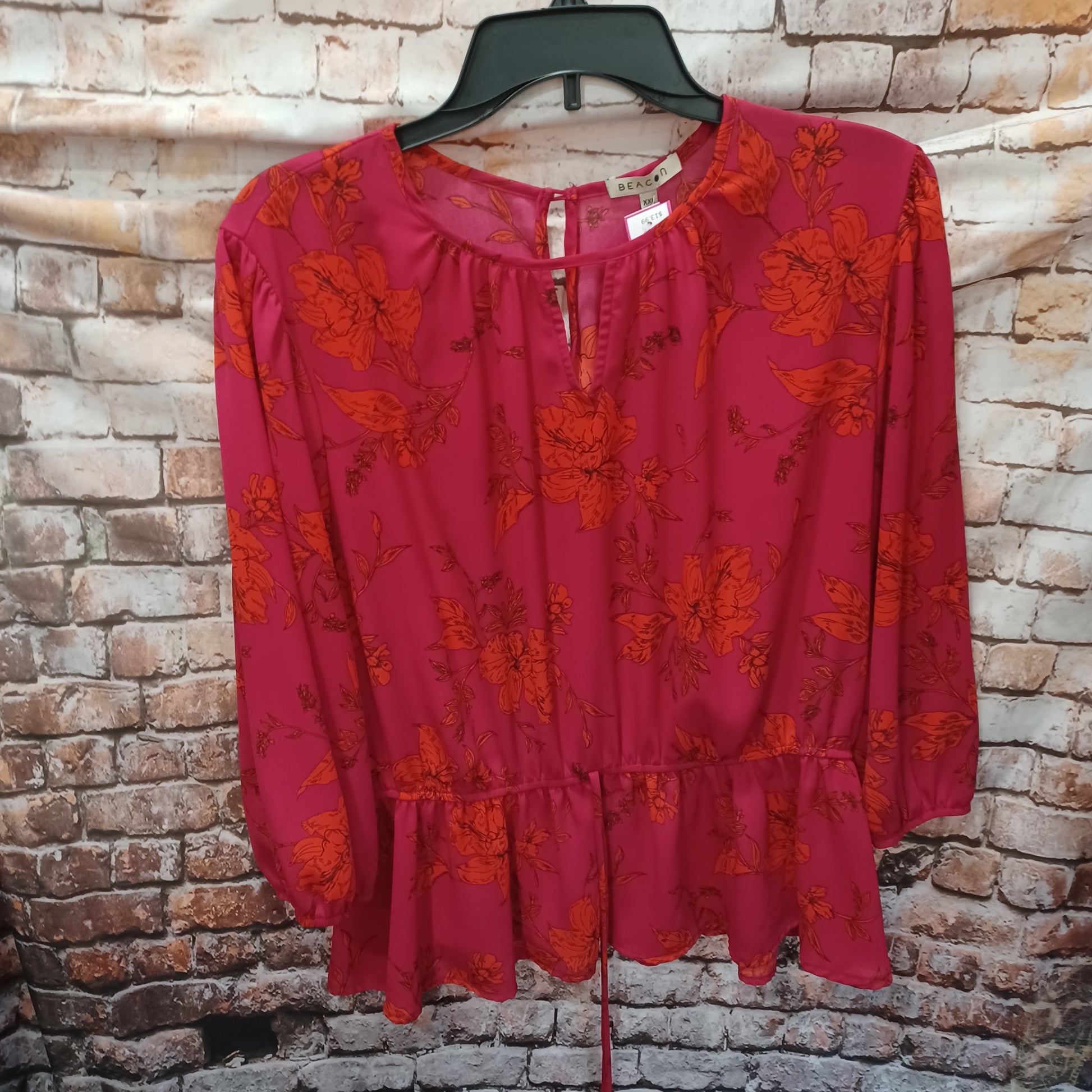 Three quarter sleeve blouse in hot pink with orange floral design. Cinched waist with elastic band and a sewn on tie. Keyhole cut out at the neck. Super sexy with class. Year round wearability.