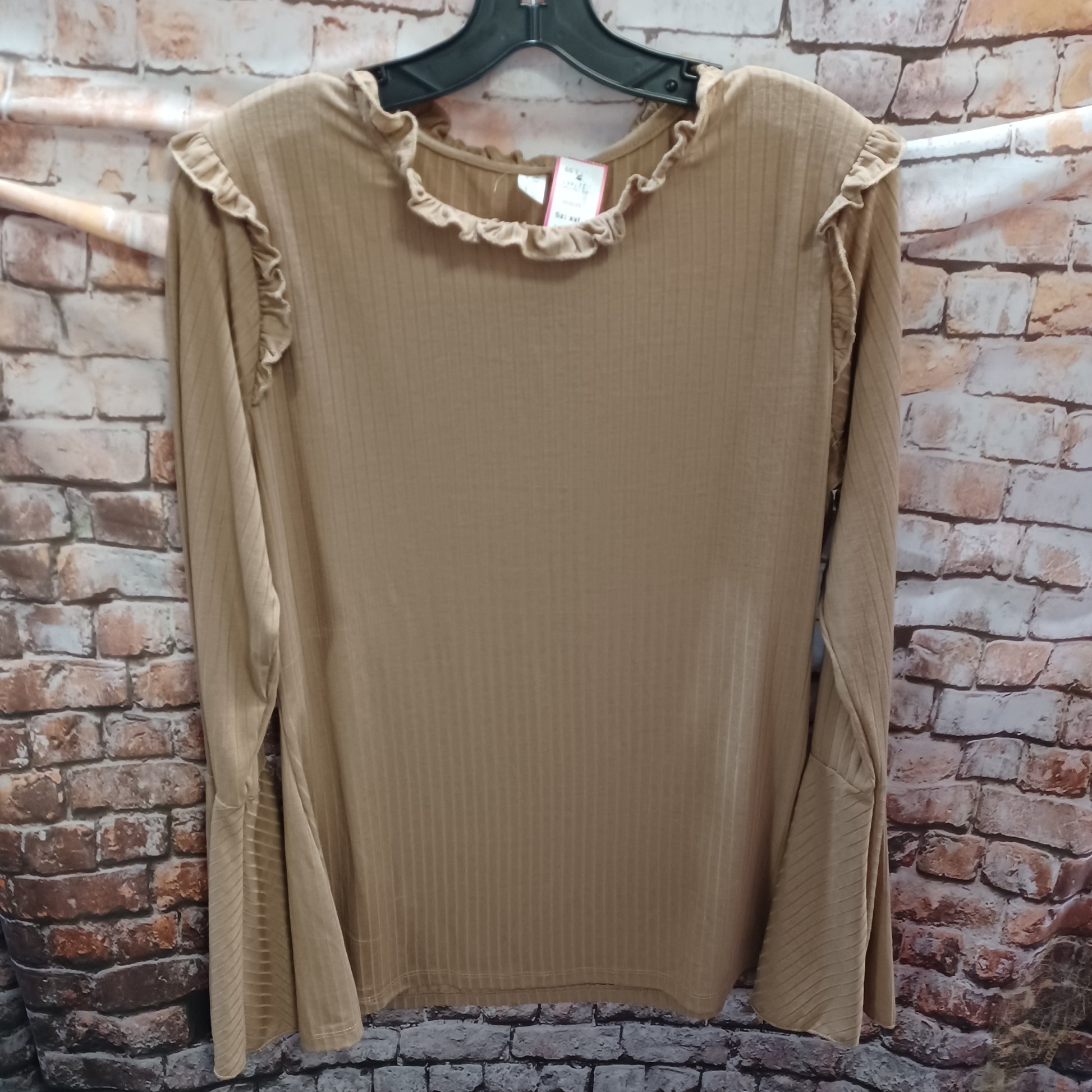 Long sleeve rib knit top with ruffled collar and shoulders. Done in tan with bell sleeve cuffs,
