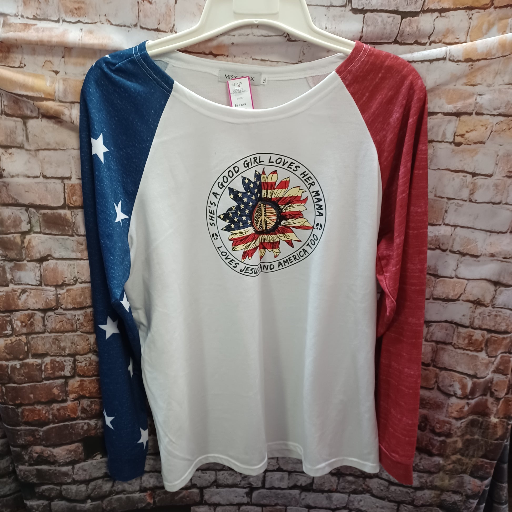 Long sleeve top in white, red and blue with Tom Petty vibes.