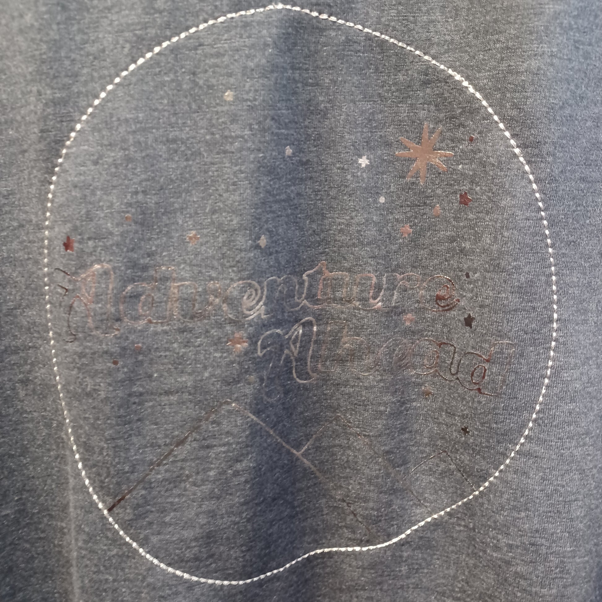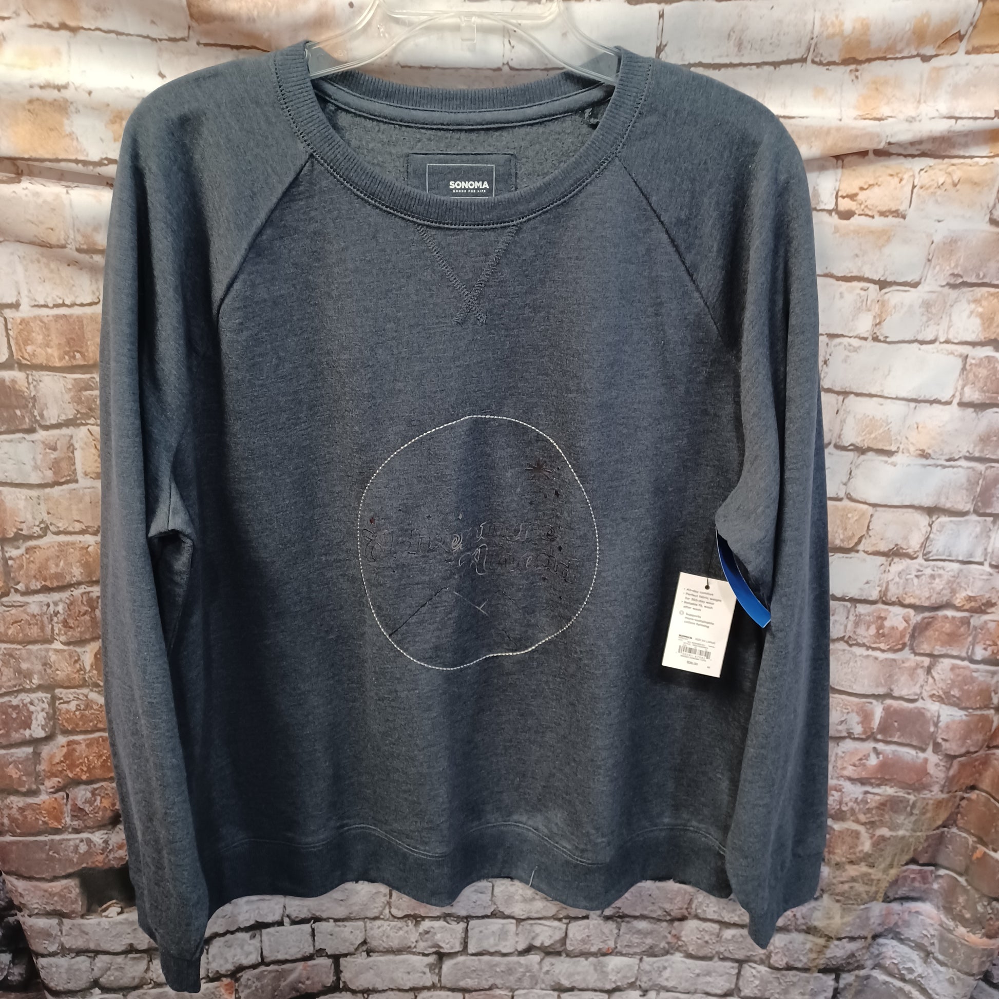 Long sleeve sweatshirt in blue with graphic in silver on the front that says Adventure Ahead. Brand new with tags.